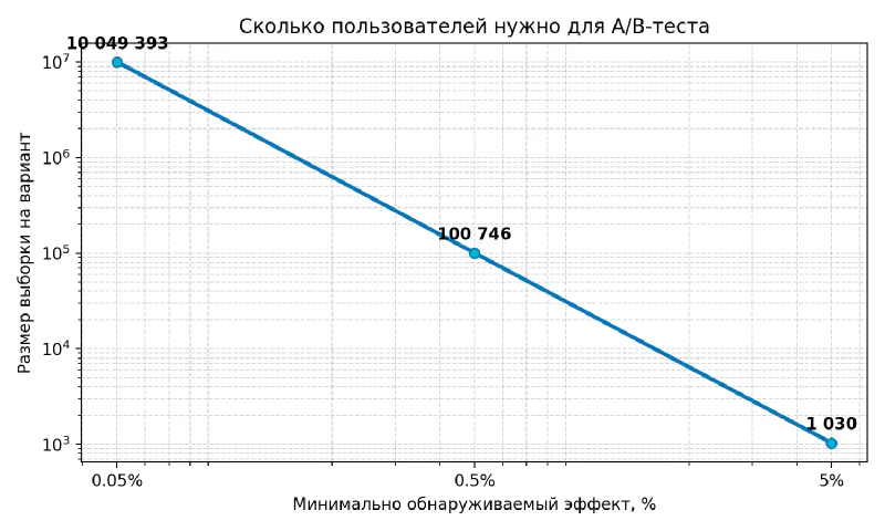 Во-первых, численную аналитику обычно всерьёз начинают применять и воспринимать только тогда, когда начинает подводить интуиция. Интуиция отлично работает в зоне «низковисящих фруктов», т. е. очевидных идей и здравого смысла, сформированного жизненным опытом конкретного индивида. Если же все «низковисящие фрукты» собраны, приходится довольствоваться снижением минимально приемлемой разницы в результатах эксперимента, а на малых значениях уже нужна «честная» математика. Калькулятор A/B-тестов наглядно демонстрирует, что уменьшение Minimum Detectable Effect в 10 раз приводит к увеличению выборки Sample size в 100 раз, а стократное снижение минимального эффекта требует увеличения выборки в 10 тысяч раз! Иными словами, стоимость эксперимента растет по квадратичному закону.
